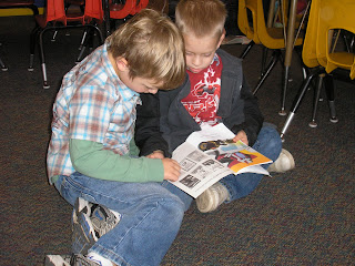 We have been learning a new component of the Daily Five. It is called "Read to Someone." During this time students practice their fluency, listening skills, problem solving, building stamina, and of course having fun. We practiced this partner reading today, and everyone enjoyed the fun! Ask your child about EEKK sitting! (elbow to elbow-knee to knee)